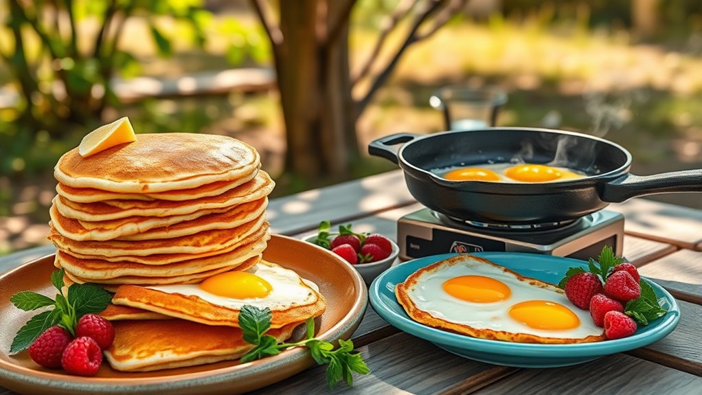 To cook breakfast outdoors, bring sturdy gear like cast iron skillets, heat-resistant utensils, and spatulas. Crack eggs into a greased skillet over your fire or stove for frying or scrambling, and prepare pancake batter in advance to pour easily on a hot griddle. Skillets are versatile for frying bacon or sautéing veggies too. With the right tools and techniques, you’ll create delicious meals that rival home cooking, and there’s more to discover to make your outdoor breakfasts even better.