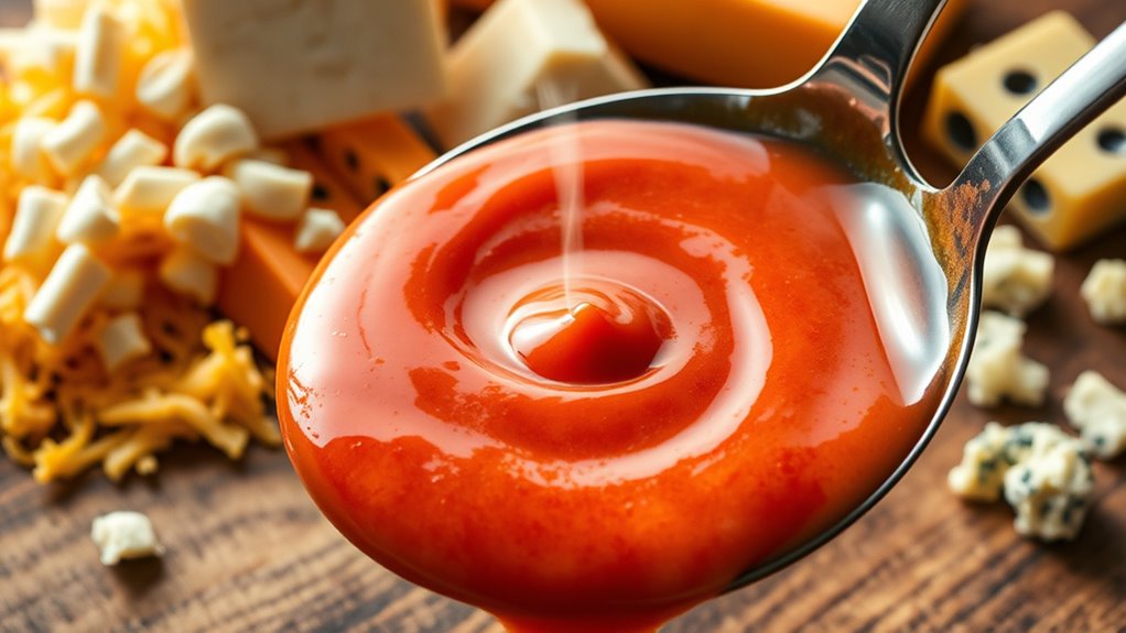 Applying the wrong amount of heat can quickly ruin your sauce or cheese by causing unwanted moisture loss or excess moisture buildup. You need to tailor your cooking techniques carefully, ensuring you don’t overheat or underheat your ingredients. Excessive heat can cause proteins and fats to break down too quickly, leading to dryness or separation, while insufficient heat may prevent proper melting or emulsification, resulting in a watery texture. Pay attention to your ingredient sourcing; fresh, high-quality ingredients respond better to precise heating. Stir regularly and use moderate heat to allow moisture to evaporate gradually without scorching. Mastering these heating techniques helps maintain the ideal moisture balance, ensuring your sauces and cheeses stay flavorful and consistent. Proper temperature control is key to moisture management.