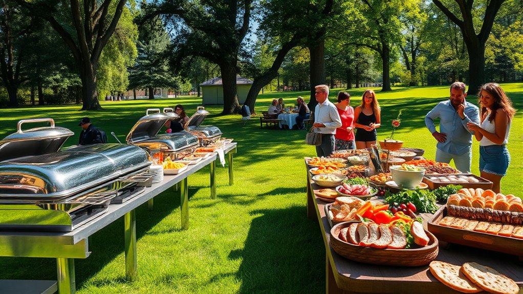 Setting up a seamless outdoor buffet requires careful planning to guarantee smooth service and a positive guest experience. Start with thoughtful table arrangements that promote easy flow and accessibility. Position tables in a way that minimizes congestion and allows guests to move comfortably. Consider the natural layout of your space and verify there’s enough room for servers and guests to navigate. Proper planning can help prevent common outdoor buffet myths, ensuring your setup is both functional and inviting. Next, focus on tableware selection; choose durable, outdoor-appropriate dishes, utensils, and serveware that can withstand weather conditions. Stack plates and utensils conveniently for quick access, and use sturdy serving trays and chafing dishes to keep food warm. Proper table arrangements combined with the right tableware help streamline the process, making your outdoor buffet efficient, inviting, and enjoyable for all.