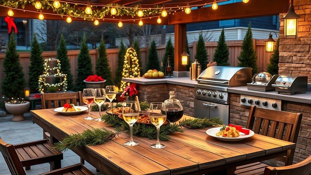 To host holiday celebrations in your outdoor kitchen, create a festive atmosphere with string lights, lanterns, and seasonal decor like pinecones and wreaths. Incorporate cozy touches with outdoor rugs, cushions, and warm throws to make guests comfortable. Set up your outdoor space as a gift station and arrange seating to encourage mingling. Use warm lighting and seasonal music to enhance the mood. Keep exploring for ideas to make your outdoor celebration truly unforgettable.