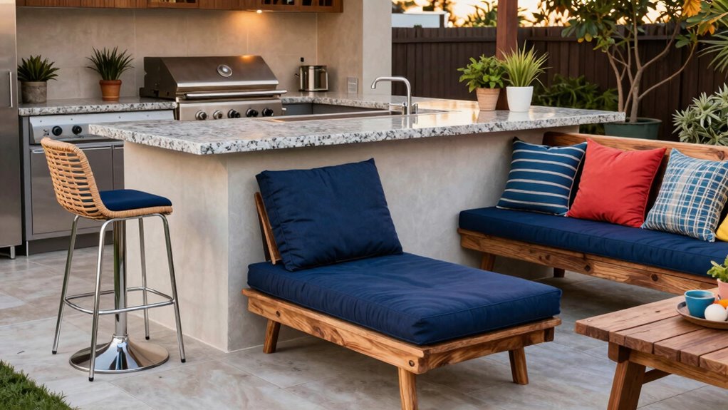 You’ll find that outdoor cushion ideas, like plush, weather-resistant cushions, make seating more comfortable and inviting. Lounge chair options with ergonomic designs and adjustable features also enhance comfort for your guests. Look for options with breathable fabrics and sturdy frames to withstand outdoor elements. Combining these styles creates a cozy, functional space where everyone can relax and enjoy the outdoor kitchen experience.