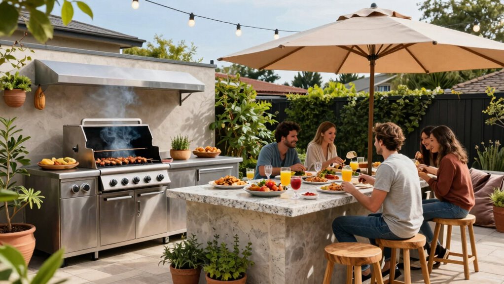 Think of your small outdoor kitchen as a cozy boat on a vast lake. With clever planning and smart use of space, you can navigate big gatherings smoothly, even without a sprawling vessel. Remember, it’s not about the size of your boat, but how skillfully you steer it. With a little ingenuity, your cozy kitchen can host grand feasts, turning every gathering into a memorable voyage. So, set sail and enjoy the adventure!