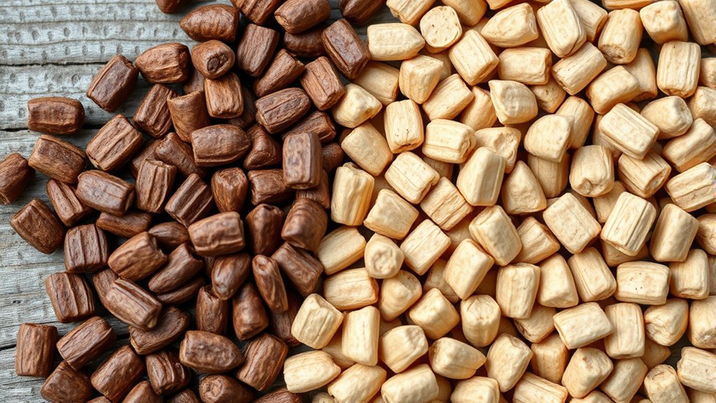 Hardwood pellets come from dense tree species like oak and maple, offering higher heat output and longer burn times, making them ideal for efficient, sustained heating. Softwood pellets, derived from faster-growing trees like pine and spruce, ignite quickly and burn faster but produce slightly less heat. Both types are environmentally friendly when sourced responsibly but differ in density and burn characteristics. To discover which pellet variety best suits your needs, explore further details below.