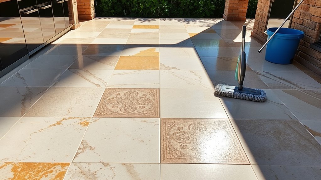 Don’t let stubborn stains ruin your outdoor space. For effective stain removal on outdoor tiles, use a mix of baking soda and water or a commercial tile cleaner designed for outdoor surfaces. These cleaning techniques help lift dirt without damaging your tiles. You might worry about harsh chemicals, but natural solutions are safe and effective, giving you peace of mind while restoring your outdoor kitchen’s beauty.