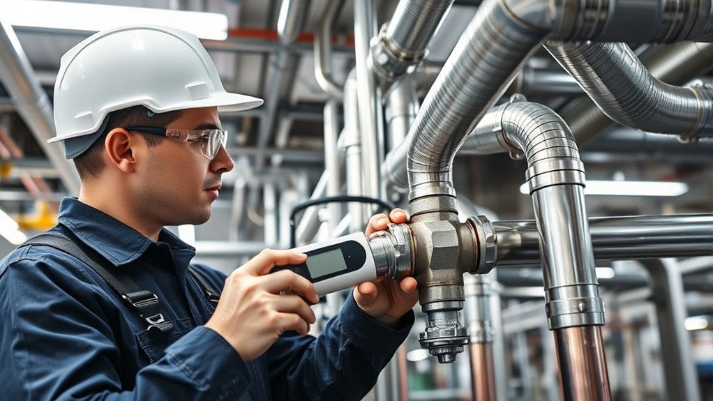 Another significant concern during inspections is material corrosion, which can compromise the integrity of your gas lines over time. Pipes made from metal—such as steel or iron—are especially vulnerable to rust and corrosion, particularly if they’re exposed to moisture or other corrosive elements. Corroded pipes may develop weak spots or pinhole leaks that are not immediately visible but can lead to dangerous leaks if left unaddressed. During your inspection, professionals will look for signs of corrosion, such as discoloration, rust flakes, or pitting on the pipe surfaces. If corrosion is detected, repairs might involve replacing sections of the pipe or applying protective coatings to prevent further deterioration. Addressing material corrosion promptly is imperative because it directly impacts the safety and reliability of your entire gas system. Regularly updating inspection techniques can help detect issues early and ensure ongoing safety.