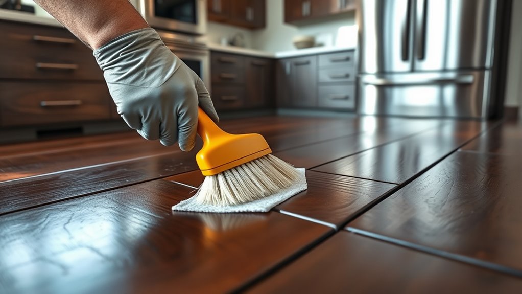 To maintain hardwood and composite decking under kitchens, you should focus on controlling moisture, preventing pests, and conducting regular inspections. Keep the area dry by ensuring proper drainage and using moisture-resistant coatings, while sealing gaps to deter pests like insects and rodents. Regularly clean debris and check for signs of rot or mold to catch issues early. If you want to discover effective tips to keep your deck in top condition, there’s more to learn.