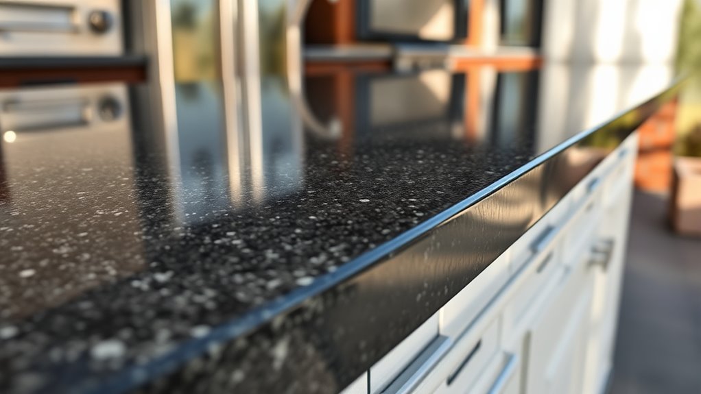 Like a sturdy ship cutting through rough seas, certain edge profiles offer better slip resistance for outdoor kitchens. Rounded or beveled edges tend to be safer, providing smoother surfaces that reduce tripping hazards. These safety features help prevent slips, especially when countertops are wet or exposed to the elements. Choosing these edges improves slip resistance, ensuring your outdoor space remains both stylish and safe for everyone.