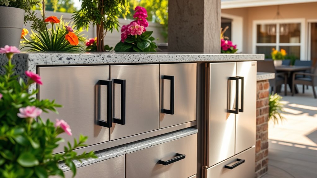 When selecting cabinets and storage solutions for your outdoor kitchen, focus on weatherproof materials like stainless steel, aluminum, or specially treated wood that resist moisture and UV damage. Look for custom options with adjustable shelves, drawers, and built-in features for easier organization. Prioritize ventilation and drainage to prevent mold and protect your equipment. These choices guarantee durability and functionality, and exploring more details will help you build a long-lasting, efficient outdoor space.