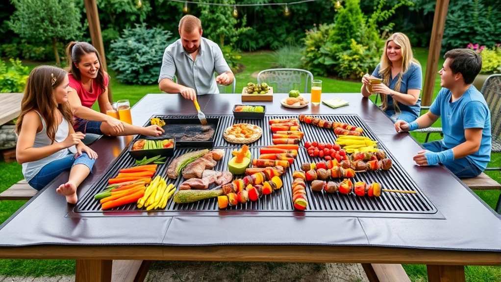 If you’re planning a family party outdoors, I recommend checking out these 15 top grill mats designed to make cooking safer, cleaner, and easier. From large, waterproof, and fireproof options to versatile silicone mats, these products protect your surfaces while handling high heat up to 2000°F. Whether you need extra-large mats or foldable options, they’re perfect for any grill setup. Keep going to discover the best choices that suit your outdoor cooking needs.