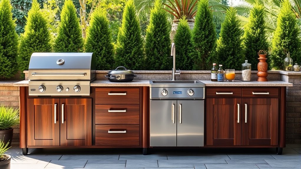 Choosing heavy duty outdoor kitchen cabinets hinges on selecting materials that can truly withstand the elements. I look for weather-resistant options like stainless steel, HDPE plastic, or powder-coated metal because they resist corrosion, rust, and deterioration from moisture and humidity. Impact-resistant plastics such as blow-molded HDPE offer durability against dents, cracks, and warping, ensuring the cabinets last even in tough outdoor conditions. UV-resistant finishes are essential, as they prevent fading and degradation from prolonged sun exposure. Additionally, water-resistant or waterproof materials protect stored items from rain, mold, and mildew. By prioritizing these features, I ensure my outdoor kitchen remains functional and attractive, regardless of the weather, making the investment worthwhile for long-term durability and resistance.