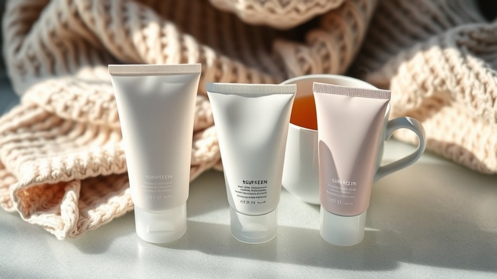 You should reapply sunscreen every two hours during winter, especially if you’re outdoors or near reflective surfaces like snow. Even on cloudy days, UV rays still penetrate, so it’s important to stay protected. I make it a habit to reapply after sweating or after wiping my face. Consistent reapplication guarantees your skin stays shielded from UV damage and keeps it hydrated and healthy throughout the colder months.