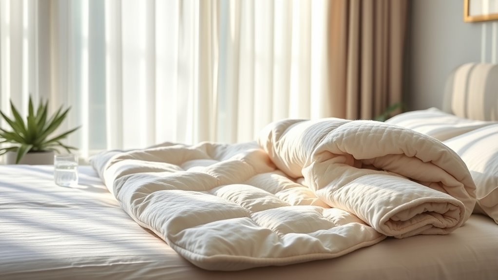 Maintaining a comfortable temperature while using a weighted blanket is essential for anxiety relief, especially since overheating can disrupt relaxation. To stay cool, look for blankets made from breathable materials like cotton, bamboo, or microfiber, which promote airflow and prevent heat buildup. Some blankets feature temperature-adaptive options, such as removable covers or cooling fabrics, to easily adjust for seasonal changes. Avoid heavy, non-ventilated fabrics that trap heat, especially if you’re a hot sleeper or it’s warm outside. Also, consider blankets with moisture-wicking linings or fabrics to help regulate body temperature and keep you dry. The key is to choose a blanket whose weight distribution and material breathability work together, ensuring you stay comfortable and relaxed throughout the night.